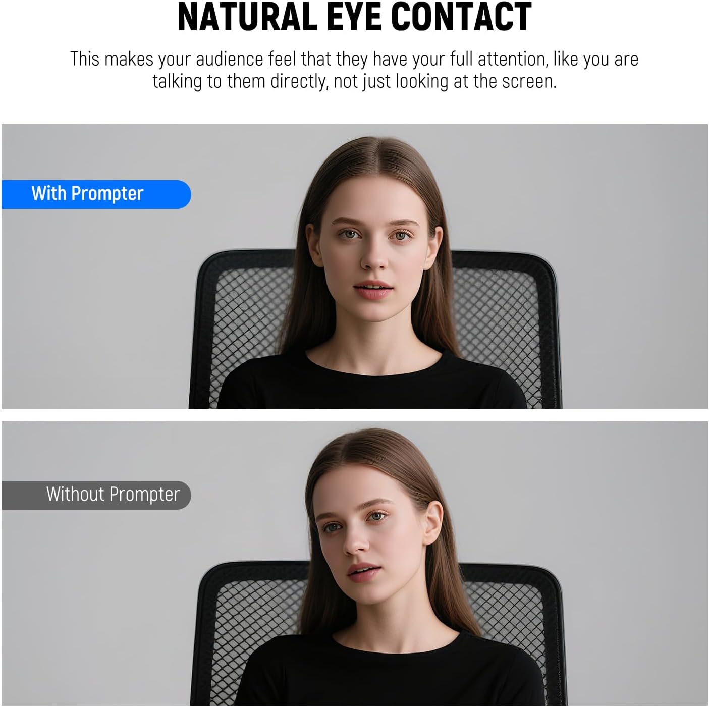 11 inch pro teleprompter with HD splinter glass: the 11 inch beam splitter has a multiple coating to prevent ghosting, and offers a light transmission of 75%, so that the text is clearly reflected on it from the prompter and is easy to read up to a distance of 2.5 m. In addition, the mobile phone prompter is equipped with a secure protective cover to minimise glare and reflections from external light sources and reduce contrast. Note: Voice sync is NOT supported.