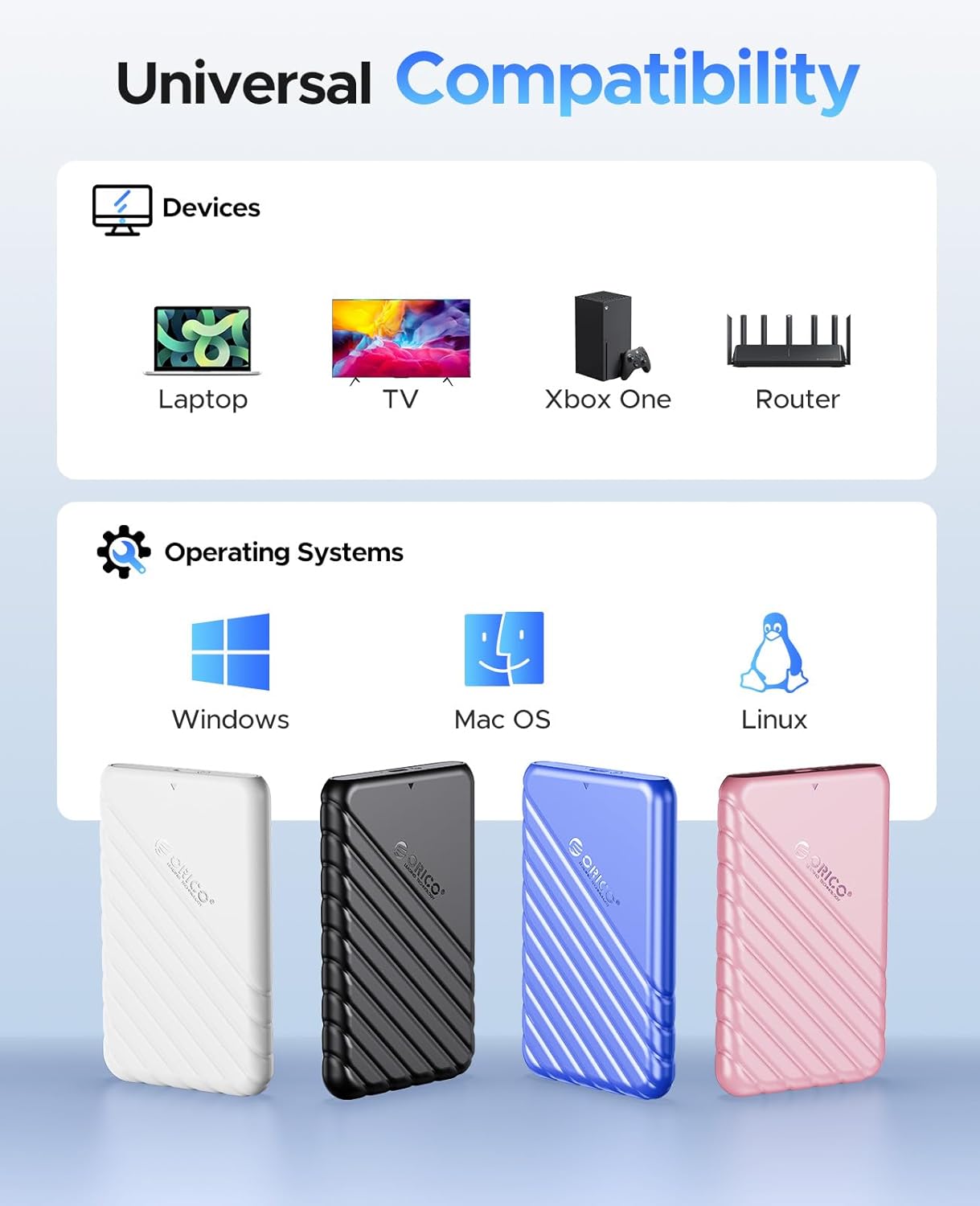 【Wide Compatibility】This SATA to USB 3.0 drive enclosure is suitable for 7mm,9.5mm 2.5 inch SATA III/ II/ I Hard Disk Drives or solid state drives. This ORICO 2.5 inch laoptop hard drive enclosure can be quickly recognized by Windows 2000/Windows 98/XP/Vista/ 7/8/10, Lunix, Mac OS 9.1/10.8.4 and above. Widely applied on PC, laptop, Xbox, PS5/PS4/PS3, Router, etc.