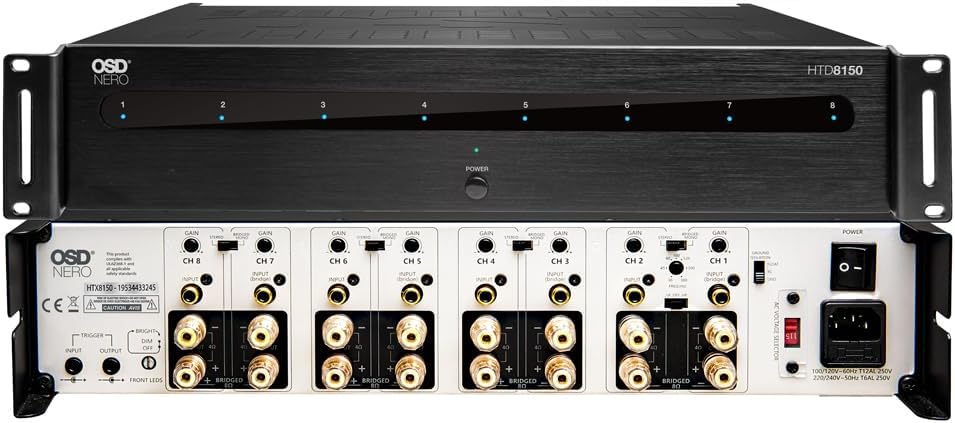 The OSD Nero 8-Channel Home Theater Amplifier delivers rich, powerful sound that transforms your home audio experience. With 175W RMS per channel, it’s ideal for home theaters, multi-zone setups, or adding depth with a subwoofer. Its flexible 8/7/6/5/4 channel bridging options & RCAs make it easy to connect & customize, while the efficient Class D ensures clean, distortion-free audio. Built to deliver exceptional performance, this amplifier will take your entertainment system to the next level.