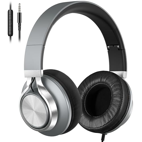 Over Ear Headphones Wired with Microphone – Noise Isolating Corded Headphones with Protein Leather Ear Cushions for Teens Adults,Fordable Head phones with Golded 3.5 mm Jack for Laptop Computer Tablet
