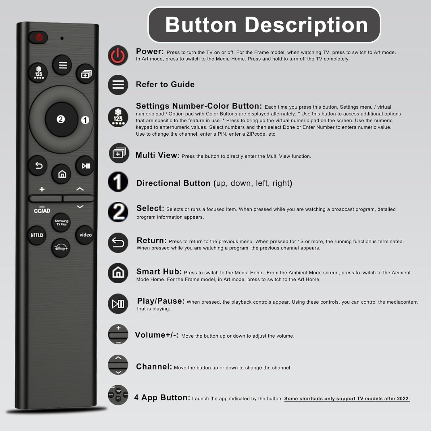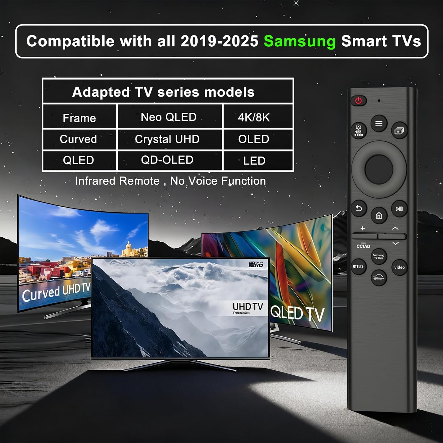 Compatible TV Models: Universal remote control for Samsung smart TV, Frame, QLED, Curved, OLED, LED, LCD, 4K/8K, Crystal UHD, 3D, HDTV models (No voice function)