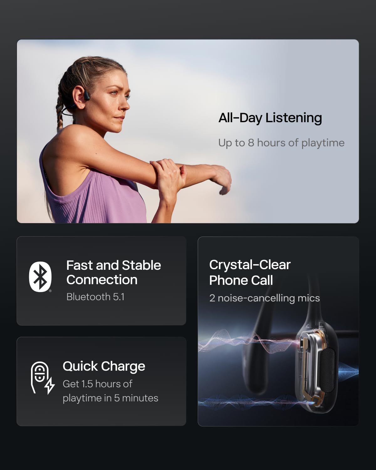 10 Hours of Music & Calls – Enjoy ten continuous hours of music, calls and podcasts with our Bluetooth headphones. OpenRun Pro also features a 5-minute quick charge for up to 1.5 hours of battery life