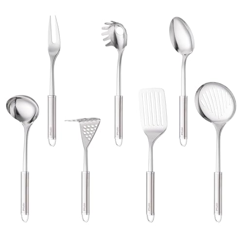 Specification: Stainless Steel Cooking Utensils Set, HIFIND 7PCS Kitchen Utensils Set, Heat Resistant Handle Utensils Set Included Ladle, Meat Fork, Slotted Spatula, Pasta Fork, Masher, Solid Spoon, Skimmer Spoon