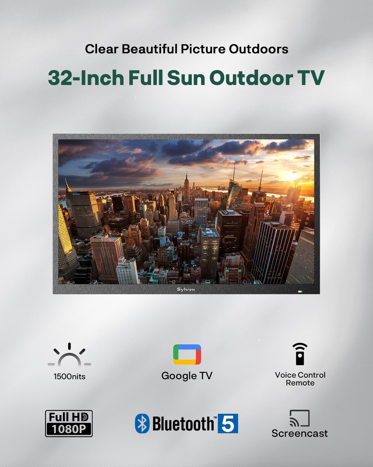 SYLVOX 32-Inch Outdoor TV, Full Sun Outside TV, 1500 Nits Brightness, IP55 Waterproof, 1080P FHD, Google Smart TV OS, Voice Control Remote, WiFi 5G, for Patio, Deck, Terrace, Backyard (Pool SE, 2025)
