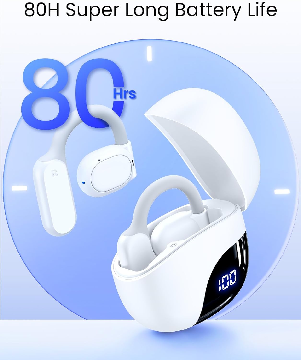 80 Hours Playtime and LED Digital Display: Each open ear earbud can play continuously for at least 13.5 hours on a full charge, and up to 80 hours with the charging case. Extra long battery life keeps you away from the hassle of frequent charging. The air conduction headphones case comes with an LED power display, so you can clearly know how much power is left in the case and whether it needs to be charged.