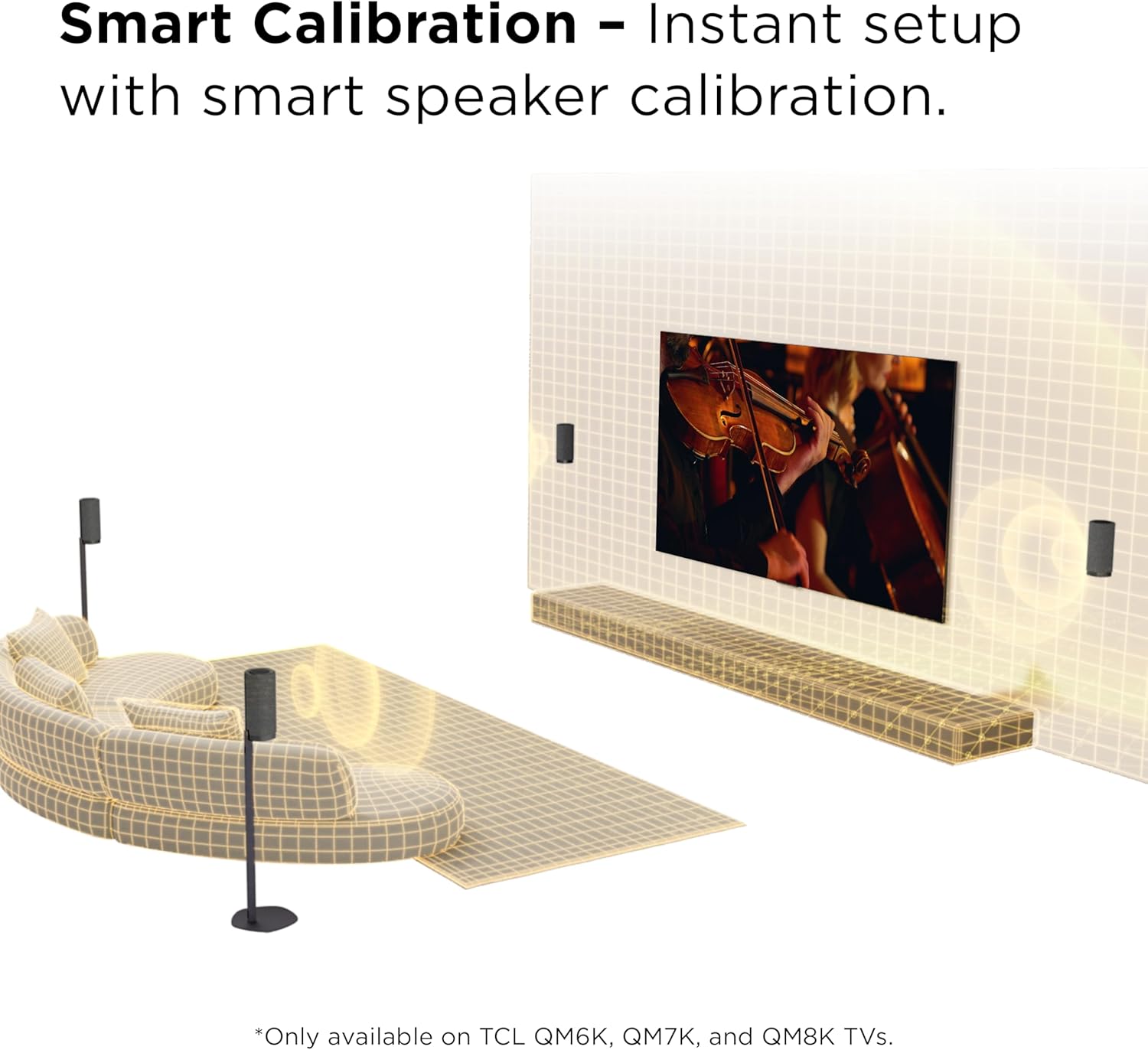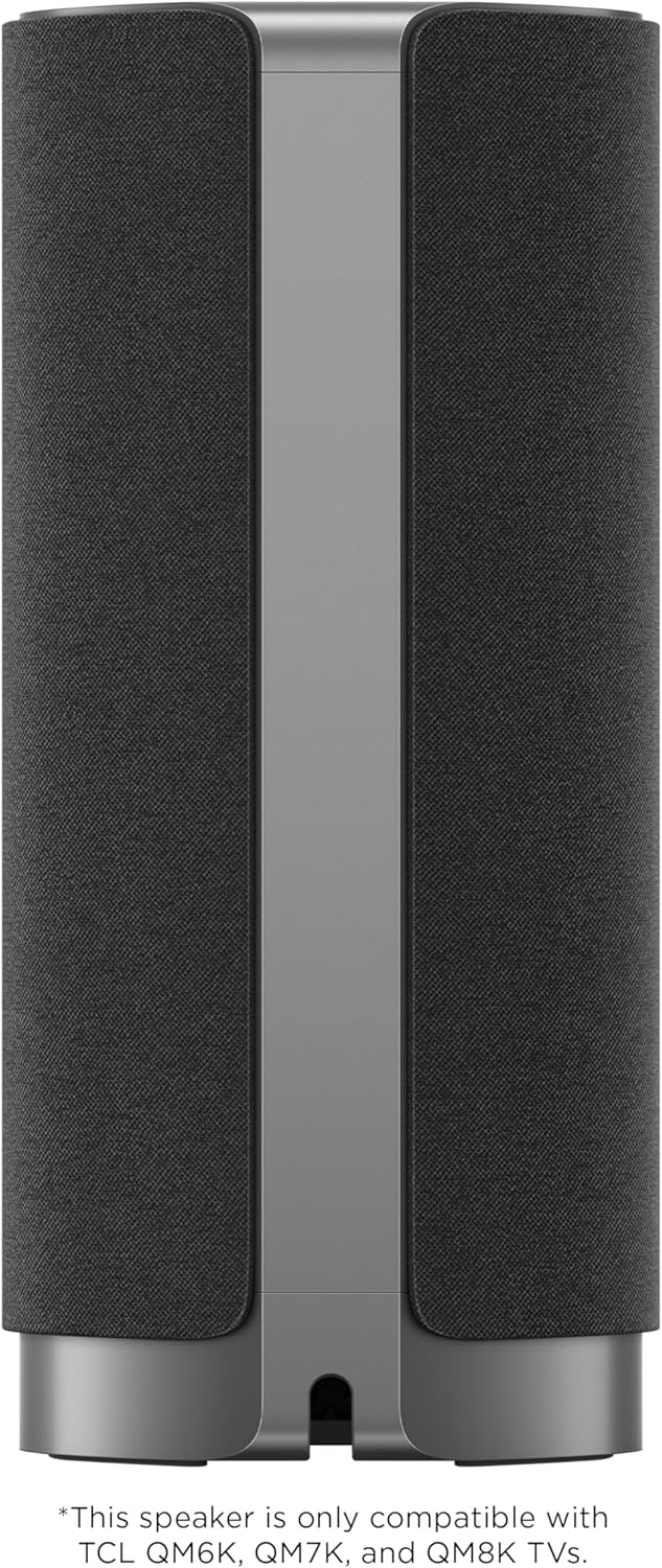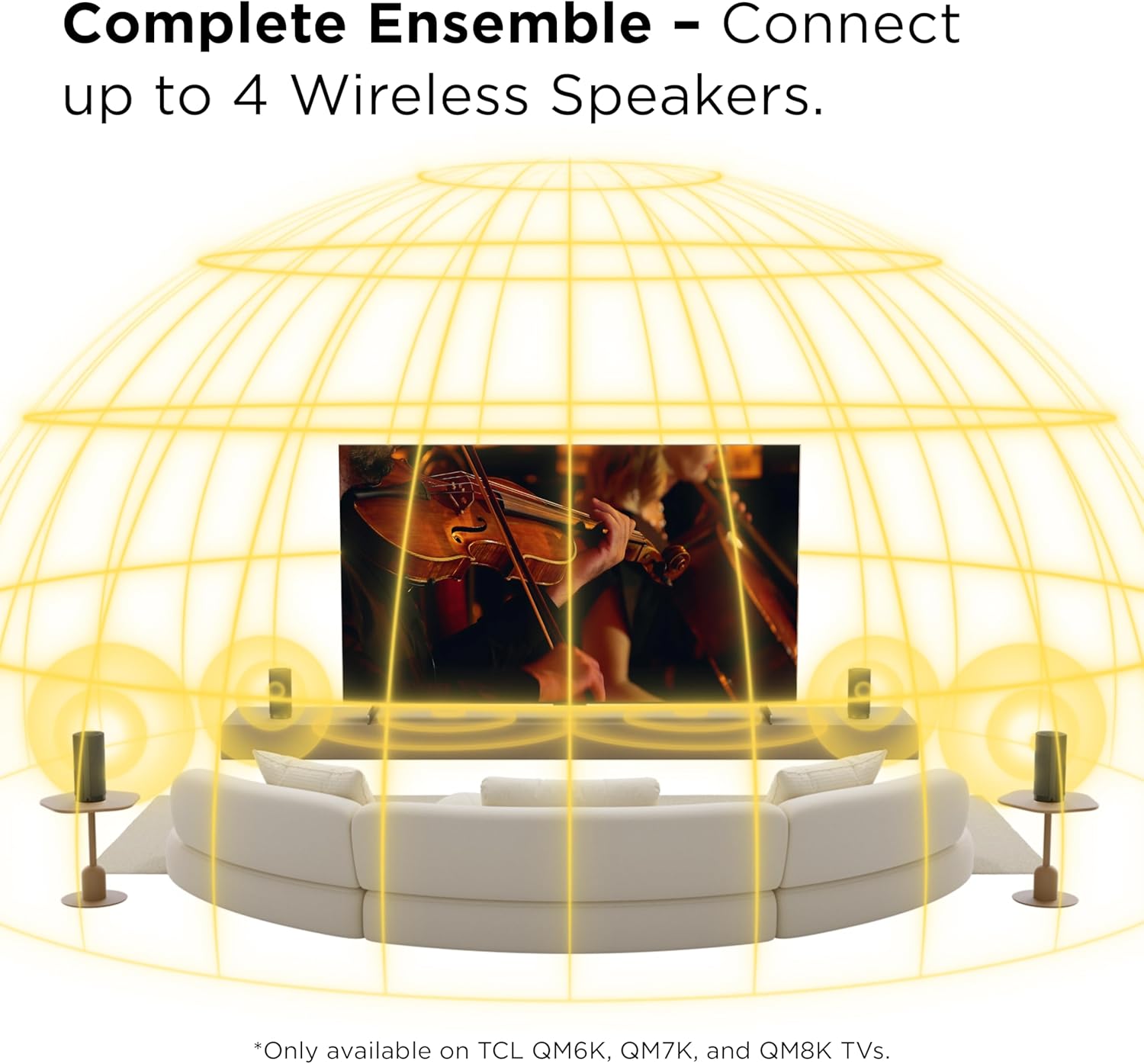 WIRELESS SPEAKER – Place the speaker anywhere. just plug it into power, and let the system automatically deliver optimized, immersive sound with no physical TV connection needed.* *This feature is only available on TCL QM6K, QM7K and QM8K, TVs .
