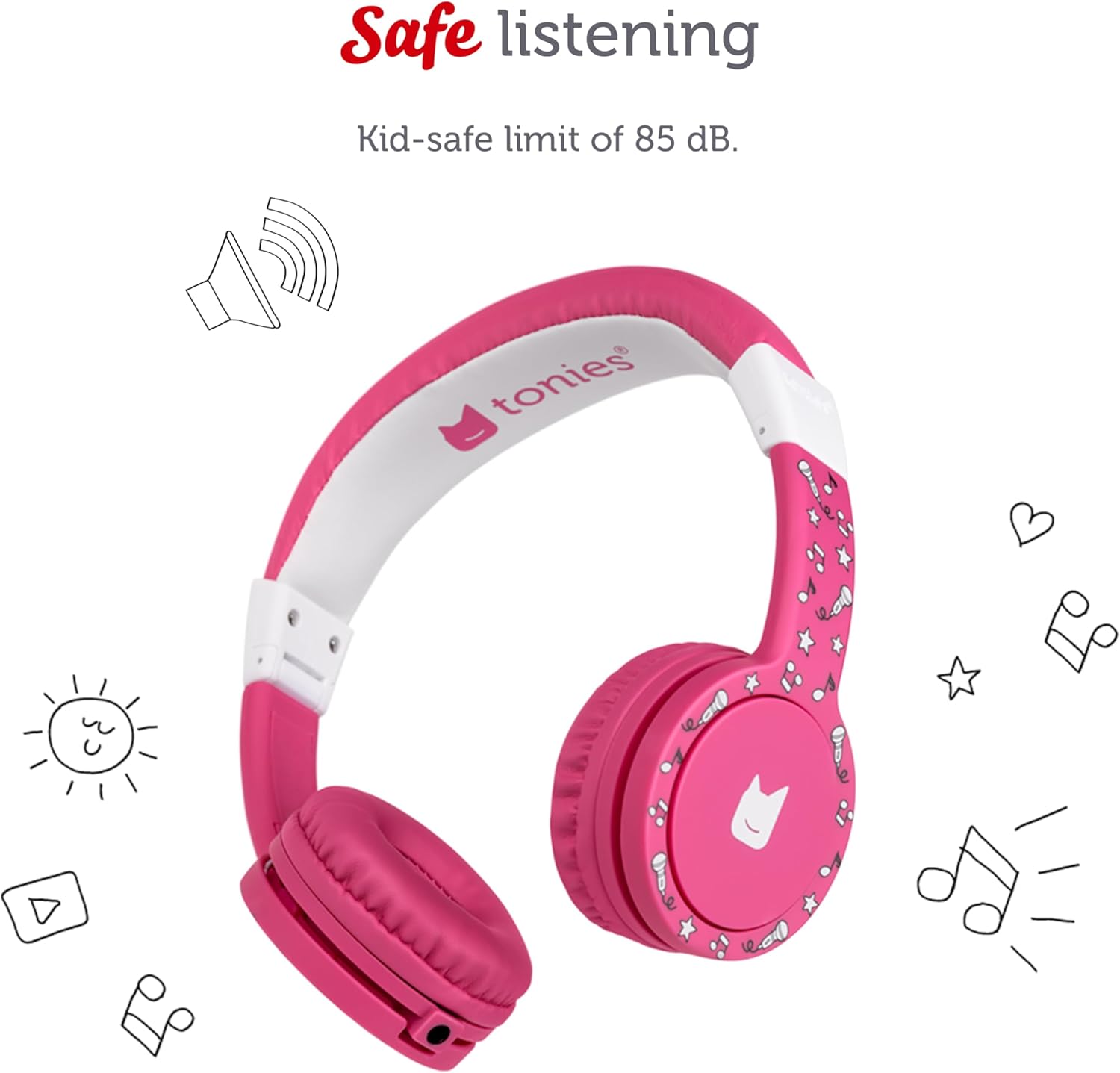 Meet the tonies Headphones, specially made for little listeners with a kid-safe limit of 85 dB. tonies headphones stay comfortable as your child grows with adjustable cushioned earpads and a padded headband. The foldable design is great for storage and travel. Available in six colors to mix and match with your Toniebox.