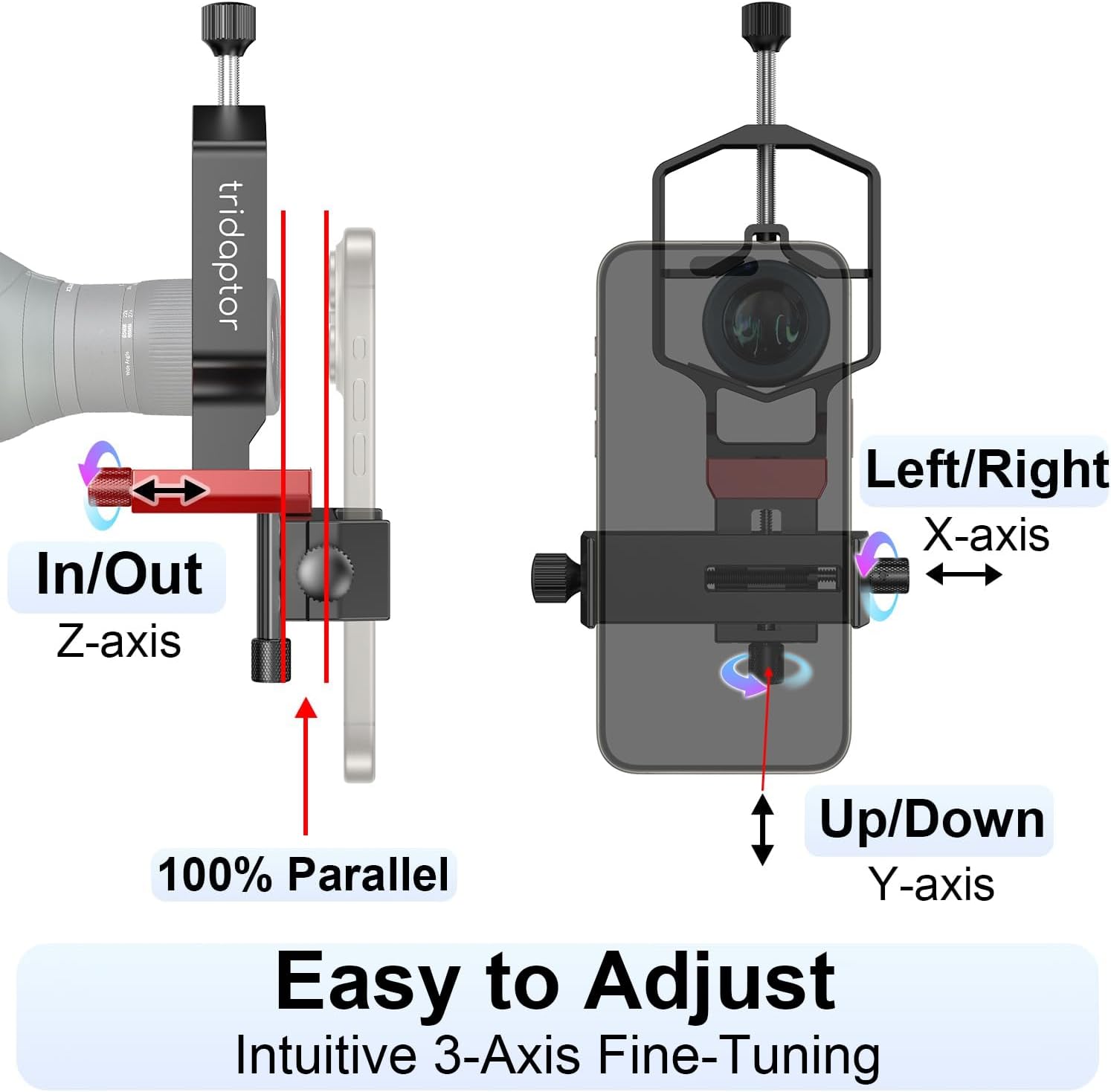 REVOLUTIONARY PRECISE 3-AXIS DESIGN (Patent Pending): (Upgraded from ACCUVIEW) The telescope phone mount features 3-direction precise adjustment, up/down, left/right, forward/backward, to align your cell phone camera with eyepieces precisely. Z axis adjustment helps reach the correct eye relief to capture the clearest images and videos of celestral objects, wildlife and other distant objects with your smartphone like never before