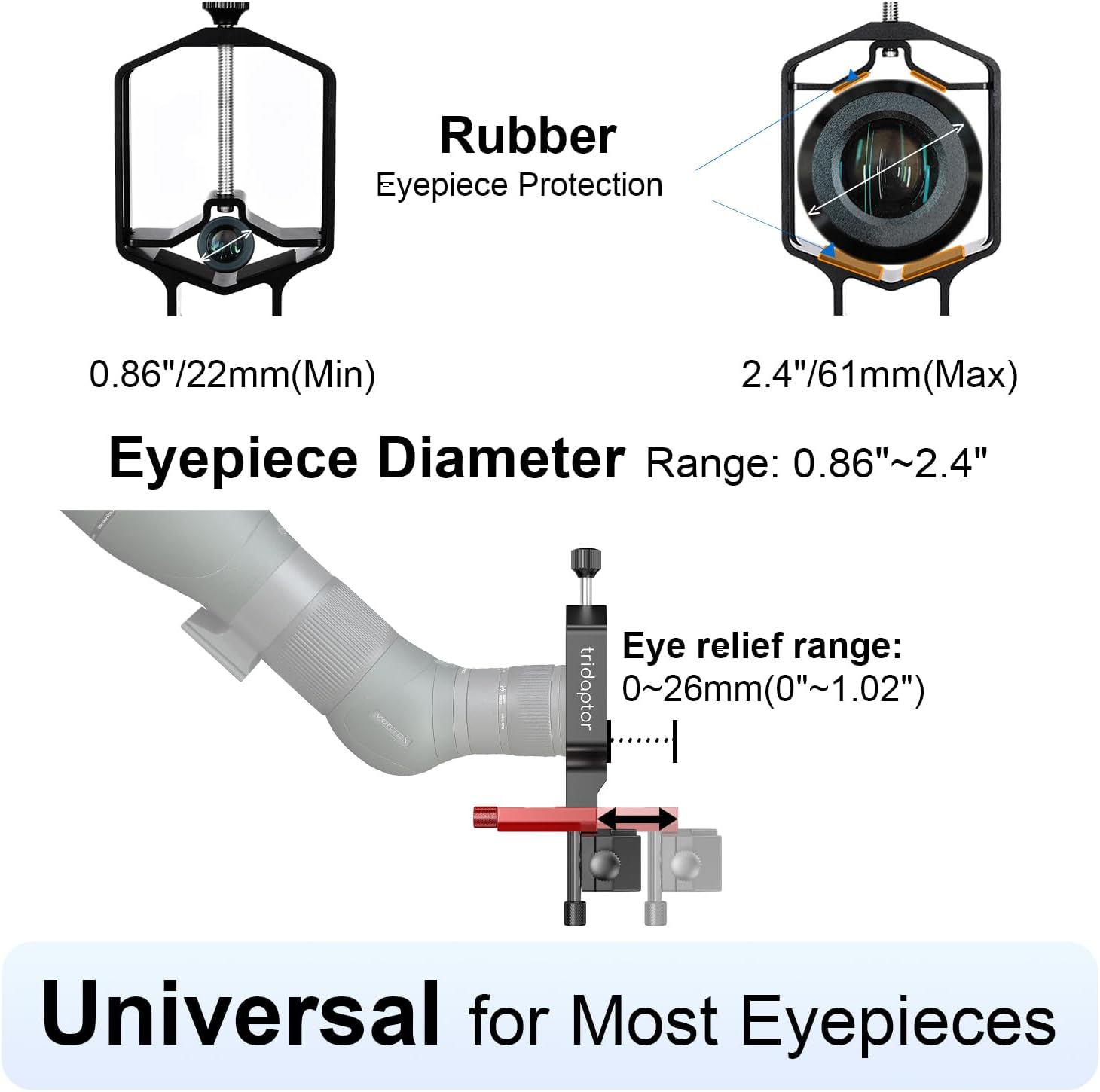 ALL METAL BUILD, NO SAGGING: Made of rigid aluminum alloy, the universal phone adapter for digiscoping is robust and durable, doesn’t bend, tilt or warp, holds your cellphone tight and perpendicular to the telescope eyepiece, maximizes stability and minimizes shaking throughout setup, with rubber pads on both the eyepiece clip and cellphone clamp protecting devices against abrasion