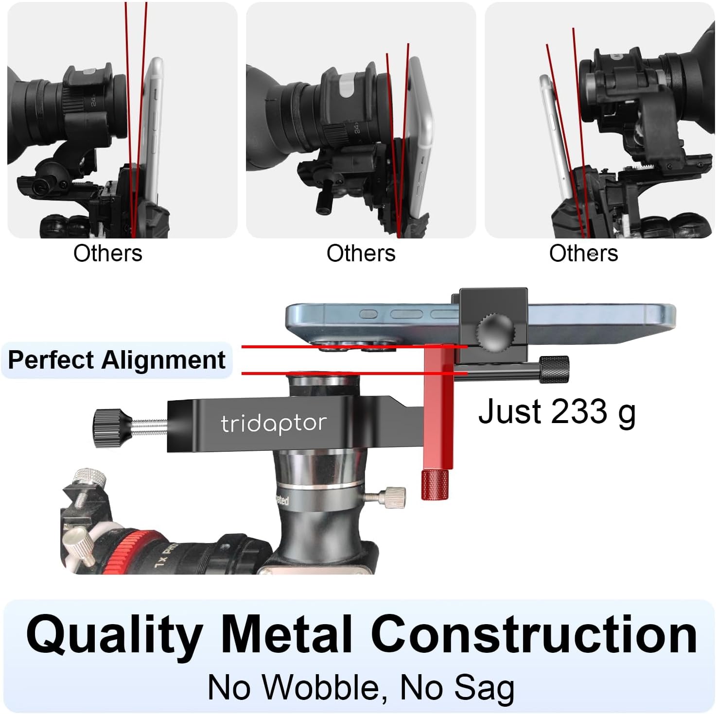 HIGH PRECISION FINE-TUNING: The smart phone adapter for telescope is engineered and machined for high precision adjustment and razor-sharp alignment with the lens. Easy-to-reach XYZ fine-tuning knobs realize stable and accurate adjustment. Firm grippers hold both the phone and eyepiece securely in place