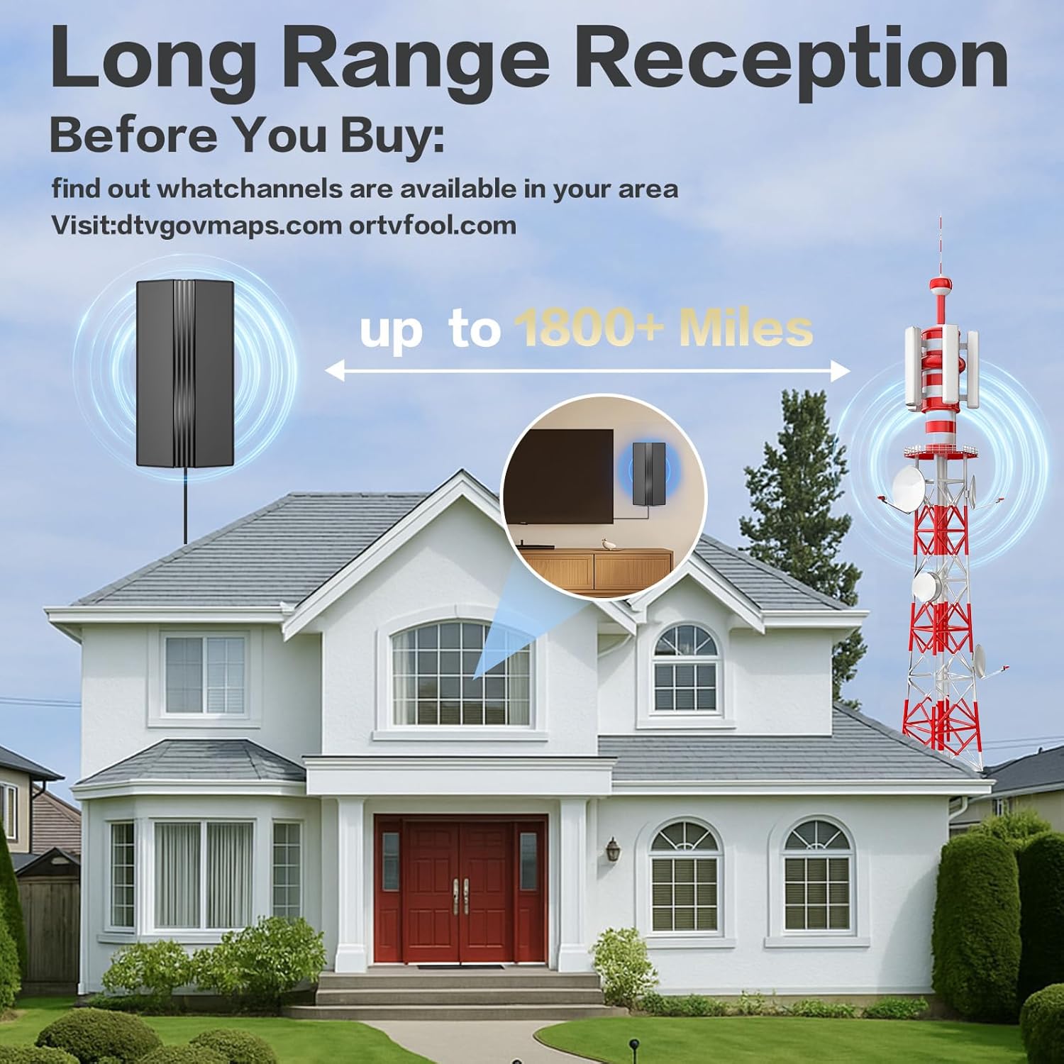 📡𝐋𝐨𝐧𝐠 𝐑𝐚𝐧𝐠𝐞 𝐒𝐢𝐠𝐧𝐚𝐥 𝐑𝐞𝐜𝐞𝐩𝐭𝐢𝐨𝐧: This TV antenna offers an impressive 2200+ miles range, providing clear and stable reception for local channels. Whether you’re using it as a TV antenna indoor or outdoor, it ensures excellent signal reception, making it perfect for smart TV and all TV types.