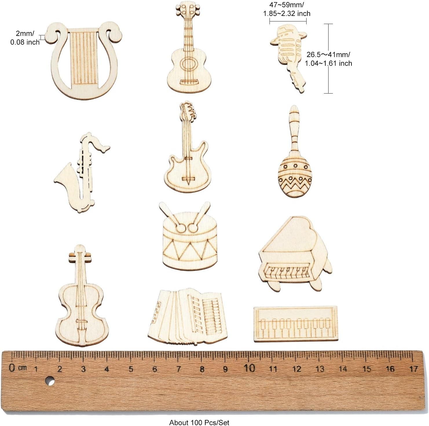 Size: These musical instruments wood cutouts are about 26.5~41mm long, 47~59mm wide, 2mm thick, total is about 200pcs musical wood crafts. Please note that our blank wood slices styles are randomly mixed, the quantity of each style may not be the same.