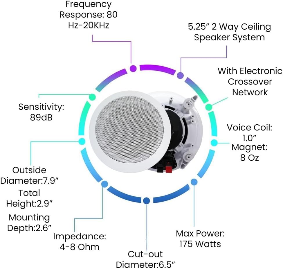5.25″ High performance 2 Way in-ceiling loudspeakerRotatable 1″ Titanium Dome Tweeter In Swivel MountSmall perforated designer grilleFrequency range: 80Hz – 20kHzPower Handling: 175 Watts Per SpeakerImpedance: 4-8 ohmsHole Cutout Size 6.5 InchDimensions: 7.9” OD. 2.9″ Deep (Depth from surface of wall board)