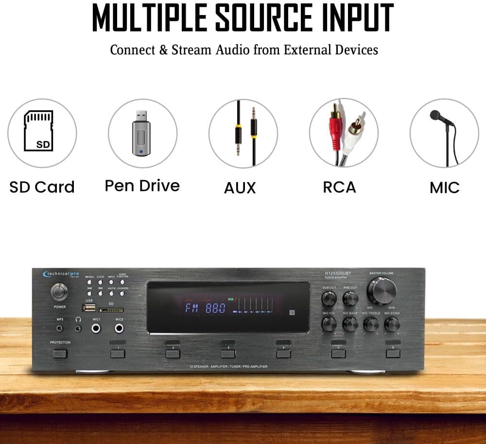 HYBRID AMPLIFIER: Transform your space with our six-zone, 12-speakers capacity hybrid amplifier system, delivering 6000 watts of power. Customize your sound management across different sections with Bluetooth v2.0 connectivity, USB and SD card inputs, and iPod compatibility. Ideal for home, bar, or nightclub use, this amplifier comes with a wireless remote for convenience.