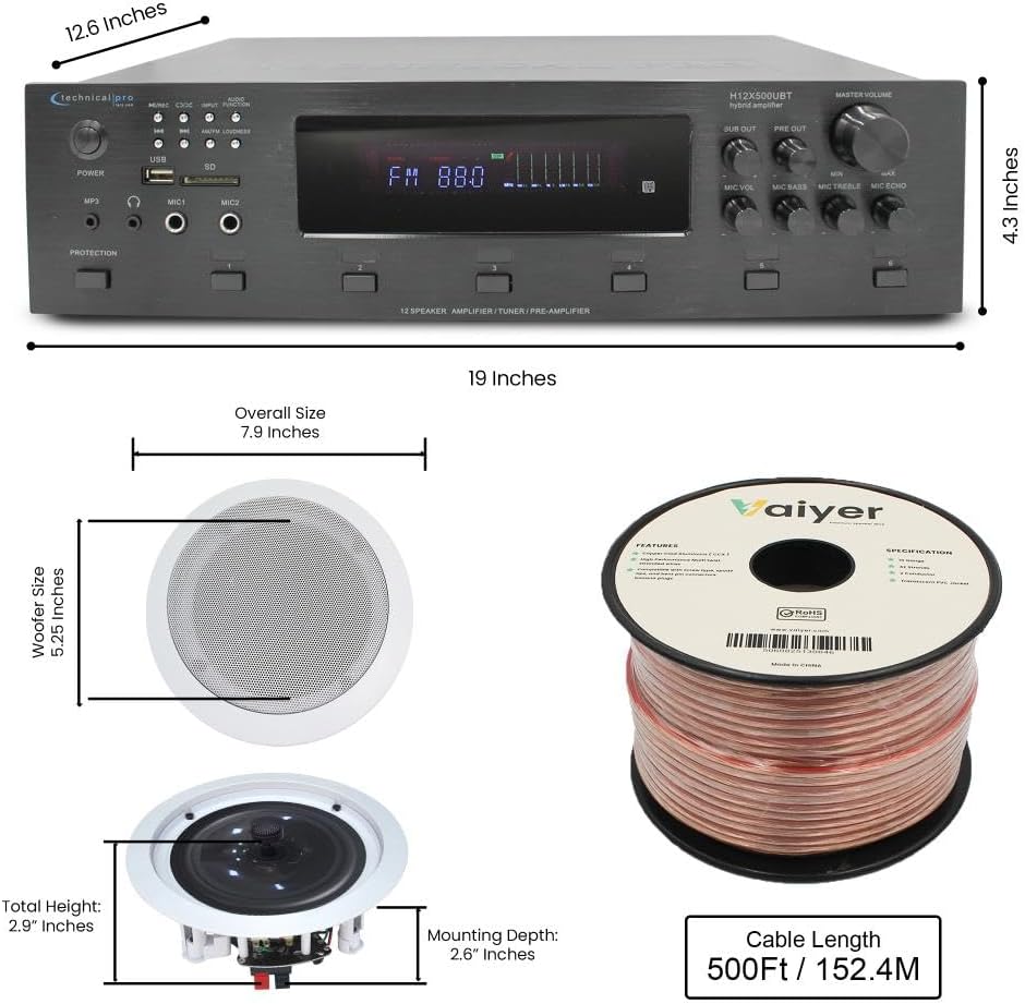 Vaiyer Home Theater System Kit, 6-Channel 6000 Watts Bluetooth Amplifier with 5.25″ 8 Qty of 175 W Each in-Wall in-Ceiling Speakers & 16 Gauge 500 ft. Speaker Wire Surround Sound System