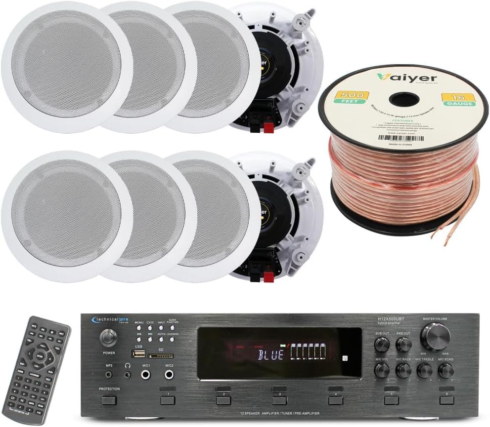 (1) 6 Zone 6000 Watts Digital Bluetooth Hybrid Amplifier Preamp Tuner(1) 500 ft Speaker Wire Cable – 16 Gauge8 QTY 175Watts Flush Mount in-wall/in-ceiling 2-Way Mid Bass Woofer Speaker