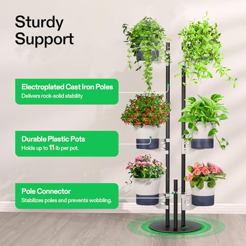 Sturdy Support: Electroplated cast iron base and poles resist corrosion and rust, and stably elevate the plants off the ground; Unique pole connector eliminates wobbles; Each planter supports up to 11 lb, securely holding your precious plants indoors or outdoors
