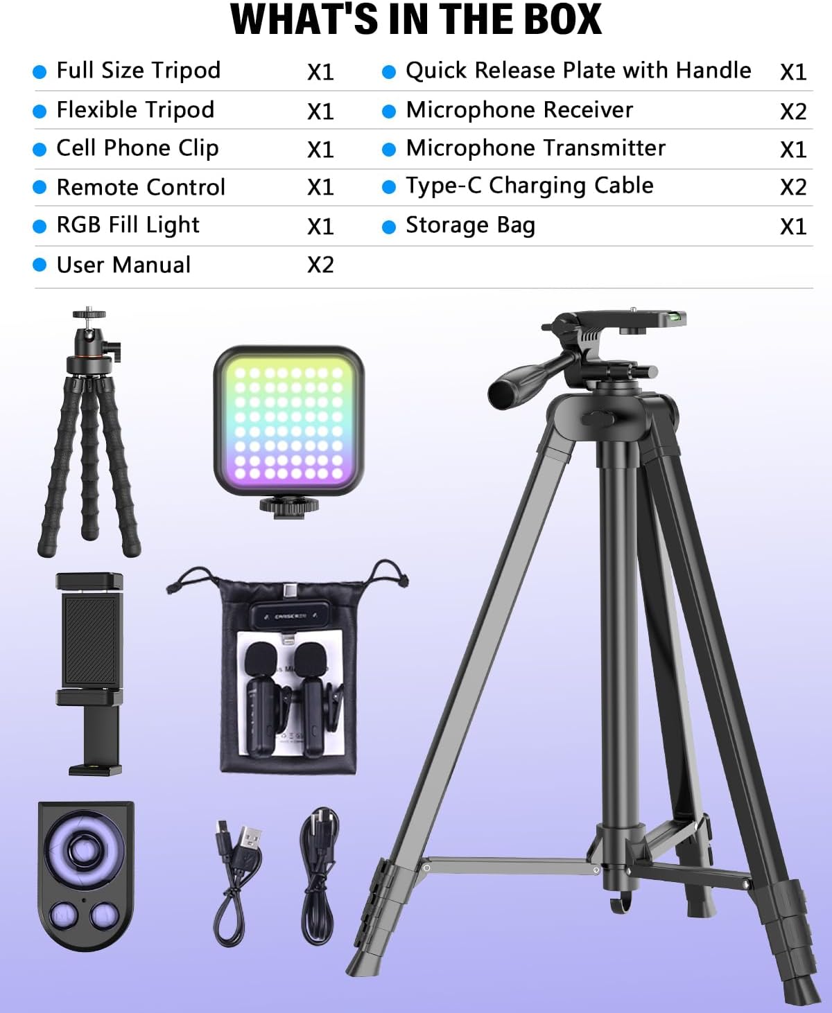 Adjustable Phone Clamp&Bluetooth Remote: The phone holder fits phones ranging from 4.7 to 7 inches, compatible with iPhone and Android devices. It offers 360° rotation and 360° tilt, allowing you to capture photos and videos from any angle. The remote charges effortlessly through a Type-C port and pairs seamlessly with your device via Bluetooth, offering a connection range of up to 33 feet. YouTube starter kit includes:Camera Tripod*1, Flexible Tripod*1, Cell Phone Clip*1, Remote Control*1, Quick Release Plate with Handle*1, RGB Fill Light*1, Microphone Receiver*2, Microphone Transmitter*1, Type-C Charging Cable*2, Storage Bag*1, User Manual*2