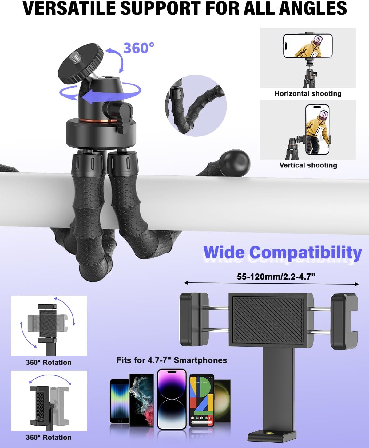 Flexible Tripod for Creative Angles: The flexible tripod adds an extra layer of creativity to your vlogging. Its bendable design allows you to wrap it around objects, achieving unique perspectives and close-up shots. This compact flexible tripod offers a 360° rotating ball head for full-angle control, enabling horizontal and vertical shots with ease. The top features a 1/4” screw nut, compatible with phone clamps and other accessories, making it a versatile addition to your vlog kit