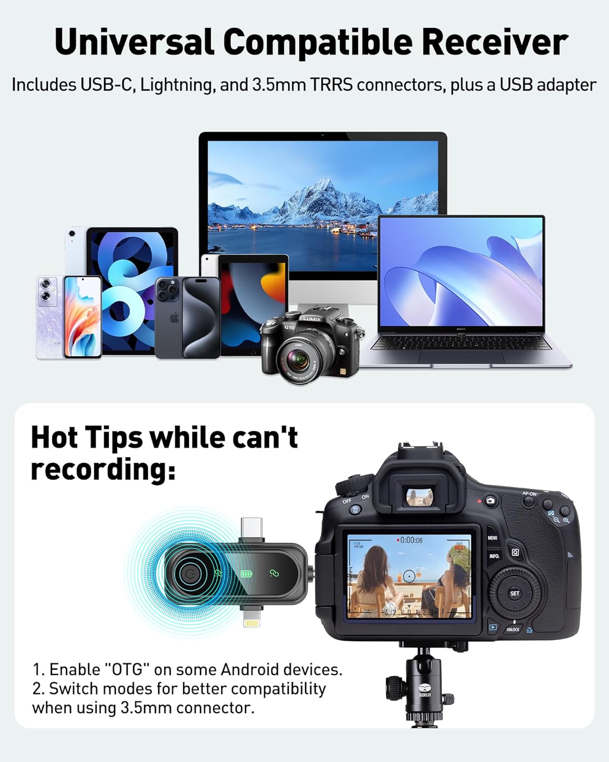 Wide Compatibility on Most Devices: There are 4 connectors provide for choose, USB C connector, Lighting connector, 3.5mm TRRS connector and an extra USB adapter. Wide compatible with iOS devices, Android devices, Computers with USB port, and camera with 3.5mm audio port. Connect effortlessly to most Android devices with the USB C plug, compatible with iPhone 15 USB C, Android phones like Samsung, tablets, pocket 3, and more. The included USB C to USB adapter allows seamless connectivity to computers for recording. Note: Some Android phones may require OTG activation, and computer devices need to set the default input device in the sound settings interface.